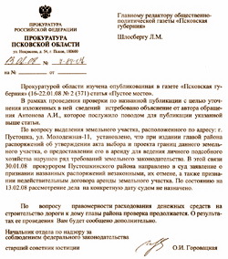 Самое главное значится в третьем абзаце ответа прокуратуры Псковской области: «По вопросу выделения земельного участка, расположенного по адресу: г. Пустошка, ул. Молодежная, 11, установлено, что при издании главой района распоряжений об утверждении акта выбора и проекта границ данного земельного участка, о предоставлении его в аренду для ведения личного подсобного хозяйства нарушен ряд требований земельного законодательства. В этой связи 30.01.08 прокурором Пустошкинского района направлено в суд заявление о признании названных распоряжений незаконными, их отмене, а также признании недействительным договора аренды земельного участка. По состоянию на 13.02.08 рассмотрение дела на конкретную дату судом не назначено».