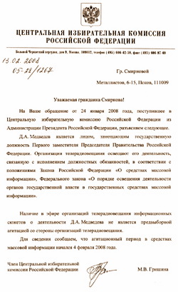 На минувшей неделе в Псков пришел ответ из ЦИКа за подписью члена избирательной комиссии РФ Майи Гришиной, датированный 13-м февраля. В нем г-жа Гришина, в частности, «разъясняет», что «организации телерадиовещания» освещают деятельность г-на Медведева на посту «Первого заместителя Председателя Правительства Российской Федерации» строго в соответствии с положениями законов Российской Федерации «О средствах массовой информации» и «О порядке освещения деятельности органов государственной власти в государственных средствах массовой информации».