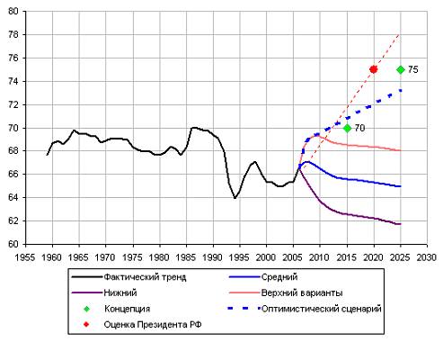 Представленный здесь же целевой прогноз выполнен в духе «зрелого социализма», то есть вопреки техническому прогнозу, но зато с учетом целевых нормативов, заданных «Концепцией демографического развития РФ» и приоритетным национальным проектом «Здоровье». В его рамках ожидаемая продолжительность жизни на 2020 год превысила 72 года. Выполнимость этого прогноза его авторы связывают с реализацией неких сугубо успешных государственных программ по борьбе с алкоголизмом, пьянством, курением, а также приходом в Россию «сердечно-сосудистой революции» по западноевропейскому типу.
