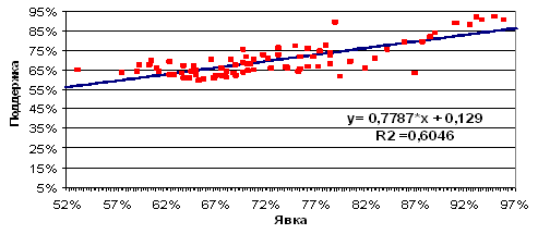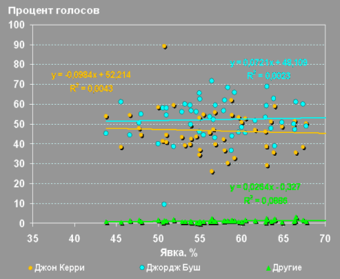 Я провел тот же нехитрый расчет с использованием доступных на сайте ЦИК данных по явке и результатам голосования от 2 марта 2008 года в разрезе субъектов РФ. Результат получился поистине стахановским: показатель R2 у Д. Медведева превысил отметку 0,6, что, к примеру, в 260 (!!) раз больше, чем у Джорджа Буша.