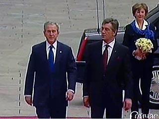 Ющенко и Буш остановились около государственного флага Украины, поприветствовали военнослужащих караула. Президенту представили членов делегации.