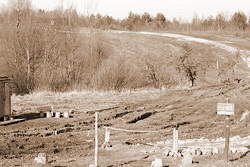 На повороте к холму проселочная дорога перегорожена самодельным шлагбаумом из осины, стоит не то сторожевая, не то строительная будка-вагончик, около нее – места для сидения из распиленных «кругляшами» стволов деревьев. На осиновом колу при въезде – место для таблички, но надпись отсутствует.