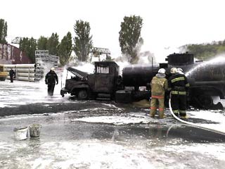 Бензовоз с цистерной емкостью 10 тонн загорелся на территории одного из предприятий, рядом с автозаправкой во время слива горючего. Пожару была присвоена высокая степень сложности.