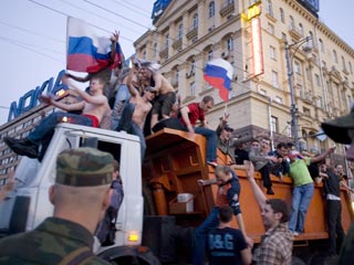 Некоторое время по Тверской улице курсировал грузовой "КамАЗ", в кузове которого уместилось не меньше 30 ликующих болельщиков. Центральные улицы Москвы в эту ночь стали пешеходными, на тротуарах молодежь, люди среднего возраста, пожилые люди и даже дети танцевали, пели национальный гимн и любимые песни отечественных исполнителей.
