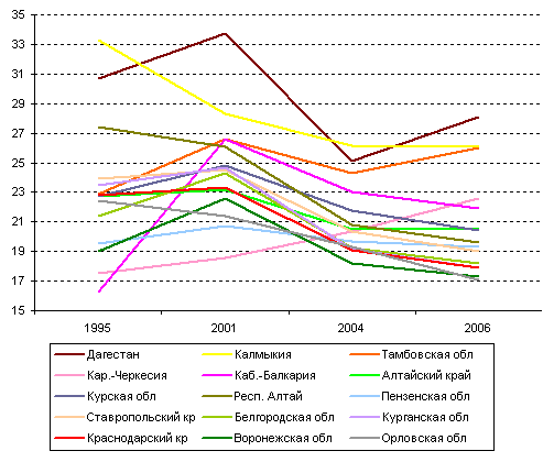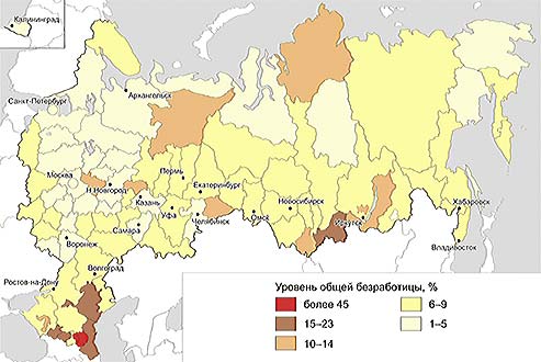 Но некоторые тенденции все же можно выделить. Во-первых, зарегистрированная безработица начала расти раньше, уже с 2001 года. В 2004 году она составила 2,6% в среднем по стране, увеличившись почти вдвое по сравнению с 2000 годом. С 2005 года началось медленное сокращение и в 2006 году уровень зарегистрированной безработицы составил 2,3%. Группа регионов с экстремально высокими показателями устойчива — это республики Чечня (70%) и Ингушетия (35%), в последней показатели даже ухудшаются. К проблемным относятся республика Тыва (8%) и недавно слитые с материнскими регионами северные автономные округа из числа слаборазвитых (7-11%). Среди аграрных регионов повышенной зарегистрированной безработицей отличается Алтайский край и республика Алтай (5-6%), на востоке страны — Амурская и Магаданская области (5%). Показатели зарегистрированной безработицы подтверждают общую тенденцию: слаборазвитые республики Северного Кавказа наряду с некоторыми северо-восточными регионами имеют наиболее сложную социально-экономическую ситуацию, их отставание не сокращается.