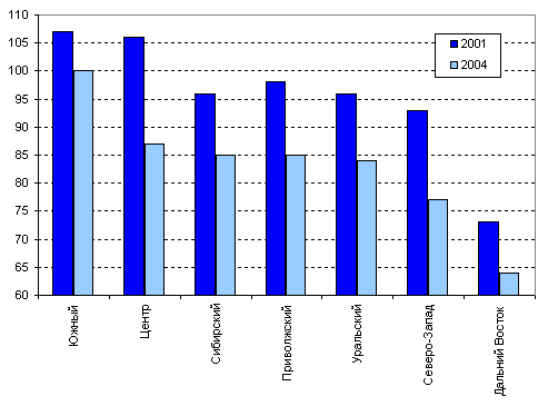 До середины 2000-х годов экономическая активность увеличивалась незначительно, а занятость даже сокращалась в отдельные годы. При этом географическая картина стала еще более мозаичной, поскольку динамика занятости все сильнее зависит от региональных факторов. В агломерациях федеральных городов рост занятости стимулировался созданием новых рабочих мест в отраслях рыночных услуг. В слаборазвитых республиках этому способствовало увеличение числа рабочих мест в социальной сфере, финансируемое за счет федерального бюджета, но такой рост не может быть устойчивым. В остальных регионах уровень занятости до середины 2000-х годов почти не менялся, а в 2002-2004 годах в половине из них даже сокращался.