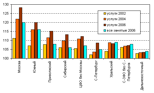 Изменения структуры занятости в секторе услуг произошли уже в первой половине 1990-х годов и были наиболее радикальными. В период кризиса роль услуг в структуре занятости возросла во всех экономических районах, наиболее существенно увеличилась доля занятых в торговле, аккумулировавшей работников, высвобождаемых из промышленности. Максимальным ростом торговой занятости выделялись крупнейшие столичные агломерации и пограничные регионы с растущим «челночным» бизнесом (юг Дальнего Востока, Калининградская область, Северный Кавказ). В Москве и Московской области доля занятых в торговле выросла за 1990-1997 годы с 7-9% до 15%, в Санкт-Петербурге и Ленинградской области — с 8 до 15-16%. Только благодаря федеральным городам произошел опережающий рост доли занятых в торговле в Центре и на Северо-Западе. Кроме того, в Москве одним из важнейших видов стала занятость в финансовых, банковских услугах, страховании и управлении (рост с 10 до 17% занятых). По сравнению с Санкт-Петербургом, Москва и раньше была городом с более выраженной сервисной структурой занятости, а в переходный период уровень ее «терциализации» стал близким к развитым странам.