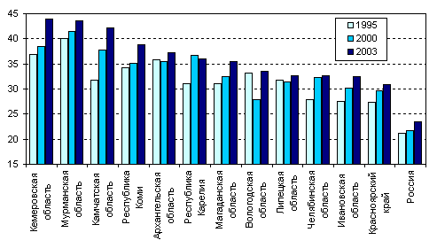 В подавляющем большинстве промышленных регионов с высокой долей занятых во вредных производствах этот показатель вырос за 2000-2003 годы (рис. 9), особенно для мужчин (с 27 до 29% в среднем по РФ). Экономический рост сопровождается ухудшением условий труда занятых в базовых отраслях промышленности, это еще одно подтверждение низкого качества роста, основанного на увеличении добычи и экспорта минеральных ресурсов и продукции первого передела.
