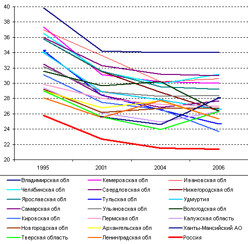 Рисунок 1. Доля занятых в промышленности в наиболее индустриальных регионах страны в 1995-2006 гг., в % от общей численности занятых Занятость в промышленности за 2006 год дана по новому классификатору (добывающие, обрабатывающие отрасли, производство и распределение электроэнергии, газа и воды). Средний показатель в 2004-2006 годах стабилизировался на уровне 21-22%, но тенденции в индустриальных регионах оказались разными. Они обусловлены совокупностью многих региональных факторов: состоянием базовых отраслей и предприятий (в более развитых регионах отток занятых замедлился благодаря опережающему росту заработков), наличием альтернативных рабочих мест в секторе услуг (для регионов с крупными агломерациями), трудовой миграцией в столичную агломерацию (для областей Центра) и другими.