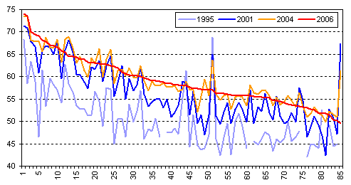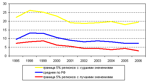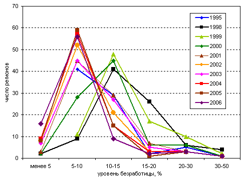 Рисунок 11. Уровень безработицы без учета 5% лучших и 5% худших регионов, % от экономически активного населения Сравнение гистограммы распределения регионов по уровню безработицы за ряд лет показывает, что потребовались три года экономического роста для возвращения распределения к кривой 1995 года. После этого, несмотря на дальнейший рост экономики, оно почти не менялось (рис. 12). Как известно, в середине 1990-х годов государственной политики в сфере занятости практически не было, следовательно, показатели безработицы после экономического шока, вызванного дефолтом, вернулись «на круги своя». Все это говорит о том, что позитивное воздействие экономического роста не подкреплялось политикой снижения региональных диспропорций на рынке труда, поэтому дальнейшего сокращения безработицы в регионах не последовало. Кроме того, стагнация региональных рынков труда обусловлена характером экономического роста последних лет — в основном за счет нетрудоемких экспортных отраслей. В результате диспропорции остались прежними и даже усилились. Для выравнивания региональных различий недостаточно перераспределения бюджетных ресурсов, требуется кардинальное улучшение условий для экономического роста в проблемных регионах.
