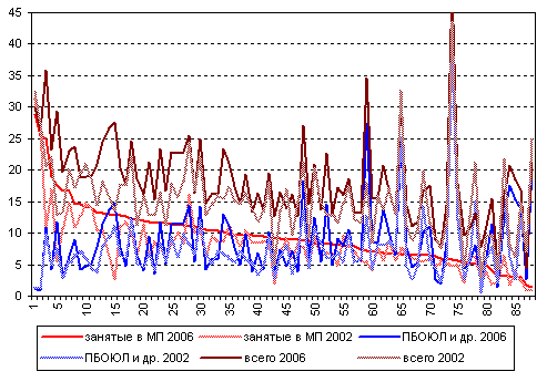 Для занятости в форме ПБОЮЛ (7,7% занятых в среднем по РФ в 2006 году) на первый план выходит совсем другой фактор — градиент север-юг, т.к. в эту форму включены занятые производством продукции ЛПХ для реализации. Во всех регионах Южного федерального округа и в черноземных областях Центра доля ПБОЮЛ среди занятых заметно выше и в основном растет. В республике Дагестан она достигла 40% в 2006 году, в Карачаево-Черкесии и Кабардино-Балкарии — четверти всех занятых, в Адыгее и Бурятских автономных округах — 18-20% (рис. 8). В слабоосвоенных северных регионах эта доля минимальна, независимо от уровня их экономического развития: и в слаборазвитых Корякском и Эвенкийском АО, и на Чукотке, и в богатых нефтегазодобывающих тюменских округах она не превышает 3%. Невысокая доля ПБОЮЛ характерна также для крупнейших агломераций с наиболее развитым малым бизнесом, оформленным как юридическое лицо. В результате суммарная занятость в малом предпринимательстве отражает и центро-периферийные, и широтные (север-юг) различия, повышая показатели трудоизбыточных и аграрных регионов.