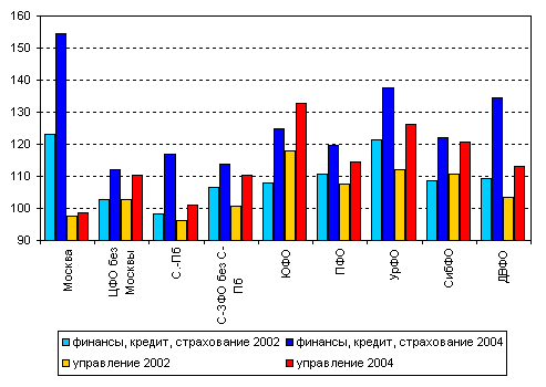 Отраслью с динамично растущей занятостью остаются финансовые услуги, такой же отраслью с начала 2000-х годов стало управление (рис. 7). Рост занятости в финансовом секторе за последние два года ускорился во всех федеральных округах (динамика по Москве может иметь искажения из-за резкого увеличения численности населения после переписи 2002 года), это позитивное следствие экономического роста. Но вряд ли можно считать позитивной тенденцией заметный рост числа занятых в управлении, ускорившийся в 2002-2004 годах. Максимальными темпами растет бюрократия как в наименее развитых регионах Юга, так и в экспортно-ресурсных Уральском и Сибирском федеральных округах. Только в федеральных городах рост управленческого аппарата удавалось сдерживать. Ожидать улучшений не приходится: за 2005 год в целом по России рост занятых в управлении достиг 11%, поэтому региональные данные повторяют эту негативную тенденцию.
