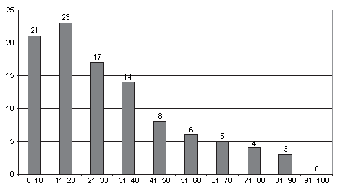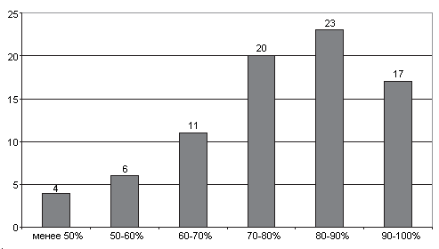 Распределение мнений опрошенных судей о том, каков процент решений в пользу работников, представлено на рисунке 2. Примерно 40% участников опроса указали долю решений в пользу работников в интервале от 80 до 100% случаев. Это хорошо согласуется с мнением о том, что нарушителями трудового законодательства, как правило, являются работодатели.