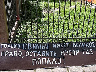 Жительница указанного дома Валентина Бурунова сообщила агентству LETA, что плакат появился у мусорных баков рядом со зданием еще в начале июля. На нем написано "Только свинья имеет великое право, оставить мусор где попало!" (орфография сохранена - прим. NEWSru.com.).