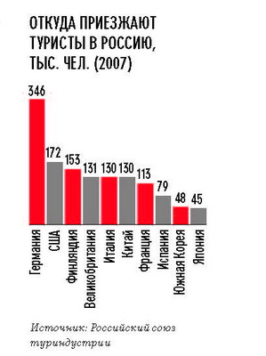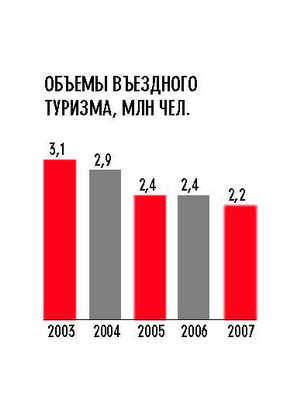 Въездной туризм в России стагнирует. По данным Российского союза туриндустрии, число приезжающих в нашу страну туристов сокращается вот уже 5 лет, и в 2007 году упало до 2,2 млн поездок. Смешно, но туризм приносит в российский бюджет столько же, сколько в Северной Корее: Россия занимает лишь 138-е место в мире по доле турбизнеса в ВВП (6,9% в 2007 году). Между тем хорошо известно, что многие страны Европы (Швейцария, Австрия, Франция, Испания) немалую часть своего благосостояния построили именно на доходах от туризма: ежегодно они зарабатывают на этом десятки млрд долларов.