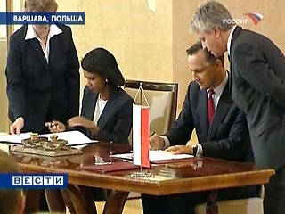 "Договор даст возможность ответить на вызовы ХХI века, укрепит связи между Польшей и США", - сказала Кондолиза Райс после того как поставила свою подпись.