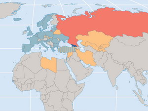 Члены НАТО: Албания, Бельгия, Болгария, Великобритания, Венгрия, Германия, Греция, Дания, Исландия, Испания, Италия, Канада, Латвия, Литва, Люксембург, Нидерланды, Норвегия, Польша, Португалия, Румыния, Словакия, Словения, США, Турция, Франция, Хорватия, Чехия, Эстония