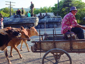 17 августа мы въехали вечером в Гори с водителем — жителем окрестной деревни. «Будьте осторожны на дороге, — предупредил русский солдат, — говорят о переодетых в русскую форму грабителях». — И добавляет: «Мы здесь, чтобы вас защищать…» Интересно, он действительно в это верит? Фразу о защите повторяют все без исключения солдаты и командиры. Грузины парируют: «Не было бы вас, не было бы нужды в защите». Впрочем, конфликтов между российскими солдатами и местными жителями нет.