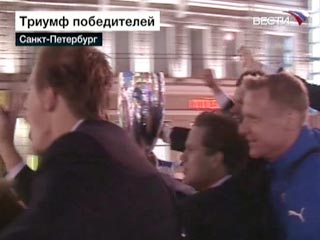 Футболисты "Зенита", вернувшиеся в Петербург из Монако с выигранным у "Манчестер Юнайтед" Суперкубком УЕФА, первым делом решили показать свой трофей жителям города. Из самолета кубок вынес вратарь "Зенита" Вячеслав Малафеев, ему помогал нести трофей Владислав Радимов.