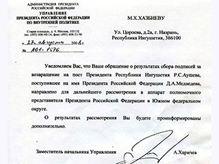Новый владелец оппозиционного сайта Ингушетия.Ru Магомед Хазбиев получил ответ из Администрации президента России по поводу поданных подписей за отставку Мурата Зязикова и возвращение Руслана Аушева на пост президента Ингушетии.