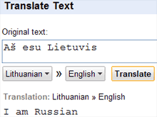 Например, предложение "Vilnius yra Lietuvos sostinė" (то есть, Вильнюс ? столица Литвы) Google переводит, как "Riga is the capital of Lithuania". Еще один вариант звучит не менее раздражающе: "Aš esu Lietuvis (Я ? литовец), программа переводит на английский как "I am Russian". Правда, если в литовском тексте слово "Lietuvis" записать с маленькой буквы, а "aš" написать как "as", то перевод будет правильным.