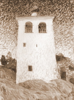 Писать псковскую архитектуру – серые плитяные крепости, белые храмы – необыкновенно сложно: они изначально графичны, их цвет не явен и порождён лишь красочным окружением. Однако в живописи нет ничего, кроме цвета (т.е. белого света, развёрнутого в спектр). Рисунок – внутренняя структура и очертания изображаемых предметов – могут возникать лишь как взаимодействие их разных цветов и оттенков.