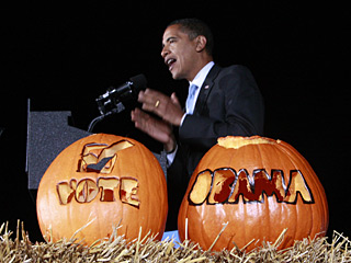 Маски кандидатов на пост главы Белого дома пользуются особой популярностью в Америке, где сегодня, 31 октября, отмечают Хэллоуин. Согласно данным Национальной федерации розничной торговли США, масок кандидата в президенты от Демократической партии США Барака Обамы было приобретено на 14% больше, чем масок, изображающих его соперника - республиканца Джона Маккейна. Как правило, побеждает тот претендент, чьих масок было раскуплено больше.