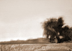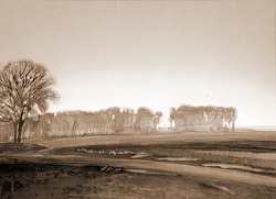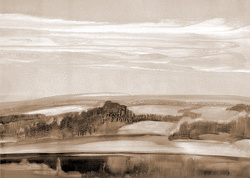 Выставка работ петербургского художника Андрея Гладилова (р. в 1959 г.), представленная на Бастионной в эти дни, вполне соответствует указанной гармонии умиротворённого покоя. Она многозначительно названа «Возвращение в Сетумаа», что влечёт целый комплекс ассоциаций с фольклорным эстонским православием. Однако автор, будучи русским ленинградцем, не имеет к этносу сету никакого отношения. Лишь сама Мальская долина, седая изборская земля (являющаяся молчаливым эпическим «героем» представленной пейзажной серии) духовно связывает творчество художника с крошечным народом, отечеством которого является. Название, избранное автором из благодарного уважения к духам-хранителям благословенного края, уводит в незапамятную дославянскую древность. Я не большой лингвист, но протяжное финское «-маа» выражает материнское начало земли (по аналогии с «Русь-матушка», «мать сыра земля» и т. д.)