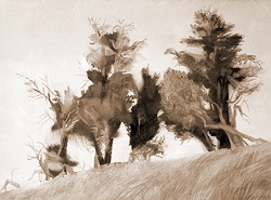 С иной стороны к достижению сходного эффекта приближается и график А. Гладилов. Он также предельно обобщает, типизирует конкретную форму (наиболее показательны здесь изображения вечерних деревьев). Однако «пишет» этот автор свои концентрирующие смысл символы не светом, пробивающимся изнутри работы, но, напротив, тональным затемнением белизны бумажного листа. Оба художника, следовательно, соотносятся, как два тоновых «полюса» в негативе, как день и ночь. Такова пропасть между двумя противоположными природами – живописи и графики (необходимой основой каждой из которых остаётся рисунок).