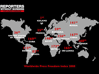 В ежегодном рейтинге уровня свободы слова международной организации "Репортеры без границ", борющейся против цензуры и за освобождение журналистов, Россия заняла 141-е место. Страна расположилась между Йеменом и Тунисом.