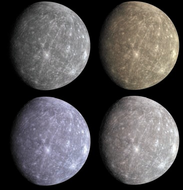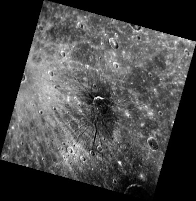 «Парадный портрет» собран как мозаика снимков, сделанных с расстояния от 12800 до 16700 км. Снимок дан в искусственном цвете, хотя цветом это можно назвать с большой натяжкой: Меркурий по существу черно-белый и очень темный, как, впрочем, и Луна.Зато черно-белый портрет весьма выразителен. Бросаются в глаза белые лучи, идущие от кратеров. От одного из них (вверху) лучи идут почти через всю планету, придавая ей сходство с арбузом. Светлые лучи — струи выброшенной породы при ударе астероида. Они не такие уж светлые, просто светлее остальной поверхности, потемневшей за миллиарды лет от бомбардировки космическими лучами.На этом — нечто уникальное для Меркурия: система борозд, расходящихся из одного центра. Ей дали прозвище «Паук», и официальное имя Panteon Fossae — «fossae» переводится как «канавы» или «борозды». Причинная связь с кратером в центре неясна, по этому поводу планетологи продолжают спорить. Вполне возможно, кратер (его диаметр — 40 км) появился там случайно и позже. Относительно возможной природы борозд в комментарии NASA ничего не сказано.На этом снимке кратер, украсивший лучами пол-Меркурия, показан крупным планом, его диаметр 110 км.На двух последних снимках — два очень отличающихся друг от друга участка поверхности: гористый и сильно изрытый с тектоническим разломом,прорезающим кратеры, и более гладкий, как будто заплывший лавой, с гораздо меньшим числом кратеров меньшего размера.Здесь показан результат попытки подобрать планете цветовую гамму на основе снимков ^ с тремя светофильтрами при разных способах обработки. Утверждается, что различия находятся в пределах различий индивидуального цветового восприятия людей.