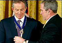 "Я знал, что если кто-то из нас попадет в беду, на другом конце телефона его всегда будет ждать друг. И мой друг ждал меня, когда 11 сентября было совершено нападение на Америку, - сказал Буш, вручая награду. - Он был вместе с нами, доказывая, что между США и Великобританией существуют особые отношения, и показал США и другим странам, что он понимает, как много было поставлено на карту в ходе войны с террором.