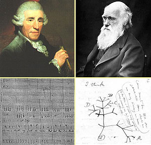В иллюстрации использованы портрет Йозефа Гайдна (кисти Томаса Харди, 1792 г.), его ноты, фотография Чарльза Дарвина (Дж. Камерон, 1869 г.), рисунок из его записной книжки 1837 г. - первый набросок идеи об эволюции.