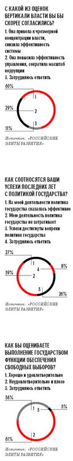 На вопрос, по какому пути развиваться стране дальше, у представителей элиты нашлось два ответа. Один, его разделяют 25% опрошенных, заключается в дальнейшем укреплении вертикали власти во главе с президентом. В то же время 68% заявили о том, что нужно «перестраивать систему так, чтобы реально обеспечить политическую конкуренцию, разделение властей, открытость и подотчетность власти обществу». По мнению социологов, это ключевой момент не только в их исследовании, но и в развитии общественного мнения.
