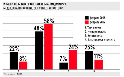 По официальным данным МВД, за первые два месяца 2009 года органами внутренних дел рассмотрено 3,34 млн заявлений и сообщений о происшествиях, что на 6,1% больше, чем за первые два месяца 2008 года. Рост регистрируемых преступлений отмечен в 24 субъектах федерации. Удельный вес тяжких и особо тяжких преступлений возрос до 29,9%. Количество выявленных преступлений, связанных с незаконным оборотом оружия, по сравнению с январем–февралем 2008 года выросло на 17,1% и составило 7 тыс., а количество выявленных фактов хищения и вымогательства оружия, боеприпасов, взрывчатых веществ и взрывных устройств возросло на 10,2%. По сравнению с первыми месяцами 2008 года на 2,3% возросло число преступлений экономической направленности, на 6% — преступлений, связанных с незаконным оборотом наркотиков, на 3,5% — преступлений, связанных со сбытом наркотических и психотропных веществ. На данный момент нераскрытыми, по данным МВД, остаются 250 убийств и покушений на убийство, 1,2 тыс. умышленных причинений тяжкого вреда здоровью, 125,7 тыс. краж, 24,7 тыс. грабежей, 2,2 тыс. разбойных нападений.