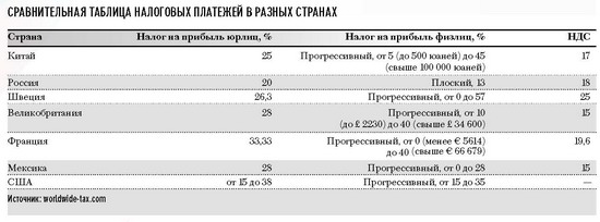 Базовая ставка этого налога с 1 января 2009 года — 20%. Раньше она составляла 24%, но была снижена правительством по причине кризиса. Кроме того, в налоговой системе были приняты некоторые изменения: увеличились амортизационные отчисления, увеличился имущественный вычет, что еще немного снизит этот налог в 2009 году. По итогам же прошлого года он составил 6% ВВП — $100 млрд.