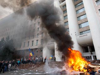 Ближе к вечеру вторника в Кишиневе, где днем начались массовые беспорядки, спокойнее не стало. Как передает "Комсомольская правда" в Молдове, после того как демонстранты захватили парламент, они переметнулись к президентскому дворцу. Первым делом группа митингующих взобралась на самый верх здания и водрузила румынский флаг под ликующие крики митингующих.
