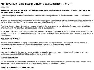 В Великобритании обнародованы имена экстремистов, которым был запрещен въезд в страну в течение пяти месяцев - с октября 2008 года по март 2009 года.