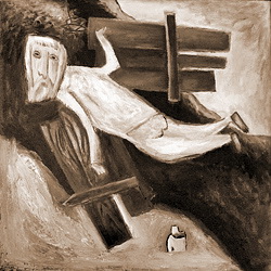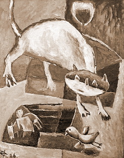 Относительно неудачными в наследии Кондратьева мне представляются некоторые созданные им портреты: в первую очередь изображения писателей – А. Платонова и М. Булгакова. В этих своеобразных коллажах на основе масляной по холсту живописи на абсолютно «потустороннее» кондратьевское пространство, полностью преображённое и пересозданное видением художника, словно наклеены (а, может, на то и коллаж?) слишком узнаваемые, слишком фотографичные лица. Эти лица – настоящие, но в «контексте» указанных портретов они воспринимаются как маски. Следовательно, сам образ писателей остаётся, на наш взгляд, не раскрыт и затуманен. При этом созданные художником графические иллюстрации к произведениям Платонова великолепны. Да и с М. А. Булгаковым роднит Д. Кондратьева не только, скажем, картина «Дикий кот» [ 3 ], но, более, вся тема человеческого полёта (упомянутая выше в связи с искусством М. Шагала).
