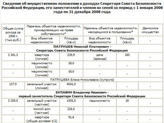 Руководство Совета безопасности (СБ) отчиталось о доходах за 2008 год. Общий доход секретаря СБ Николая Патрушева составляет 3,3 млн рублей. Судя по всему, Патрушев имел в минувшем году доход только по основному месту работы, предполагает в понедельник газета "Коммерсант". По сравнению с чиновниками администрации правительства и президента три заместителя секретаря СБ имеют скромные доходы - от 1,1 млн до 2,6 млн рублей, продолжает издание.