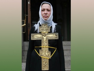 Она пришла к рижскому Христорождественскому собору босая, с покрытой белым платком головой и огромным православным крестом, который был закреплен спереди на ее платье.