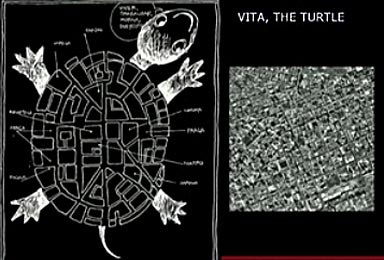 Панцирь черепахи устроен наподобие текстуры города. Теперь мы разрежем панцирь черепахи — представьте, как ей будет нехорошо. А ведь именно это мы делаем с нашими городами. Живём тут, работаем там, отдыхаем ещё где-то. Много людей живёт в самом городе, а много живёт и за городом [iii].