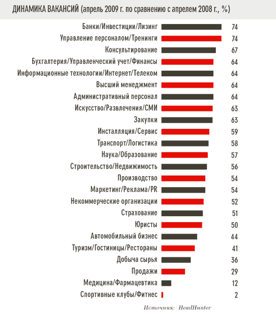 Впрочем, несмотря на кризис и растущую безработицу,¹ вакансий в стране по-прежнему много. К примеру, в Московской службе занятости в мае их значилось 230 тыс. На портале HeadHunter сегодня 46 тыс. вакансий, на портале Rabota.ru — 32,5 тыс. В лидеры по числу предложений вырвалась IT-сфера: по словам Михаила Акимова, руководителя проекта Rabota.ru, только за январь–апрель в этом сегменте появилось более 12 тыс. предложений от работодателей. Далее с большим отрывом следуют бухгалтерский учет и аудит (7,2 тыс. вакансий), логистика (столько же), маркетинг, реклама и PR (6,4 тыс.), строительство и архитектура (6 тыс.). Самая сложная ситуация, по словам Акимова, остается в сегменте «Финансы и банки»: в апреле было размещено всего 180 новых вакансий в этой нише, притом что новых резюме появилось в 6 раз больше.