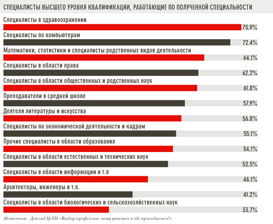 «Качество образования в России последовательно ухудшается при переходе от одной ступени на другую, — уверен заместитель директора Центра трудовых исследований (ЦеТИ) ГУ-ВШЭ Ростислав Капелюшников. — Начальное — хорошее, неполное среднее — так себе, среднее — плохое, высшее — просто из рук вон». Центр совместно с Росстатом задался вопросом: соответствует ли полученное высшее образование реальным профессиям выпускников? Итогом стал доклад «Выбор профессии: чему учились и где пригодились?» Оказалось: чуть более трети сохраняют полученную специальность, реже всего меняют профиль дипломированные врачи и педагоги, юристы и экономисты. Самыми «ветреными» оказались выпускники сельскохозяйственных и инженерных вузов.