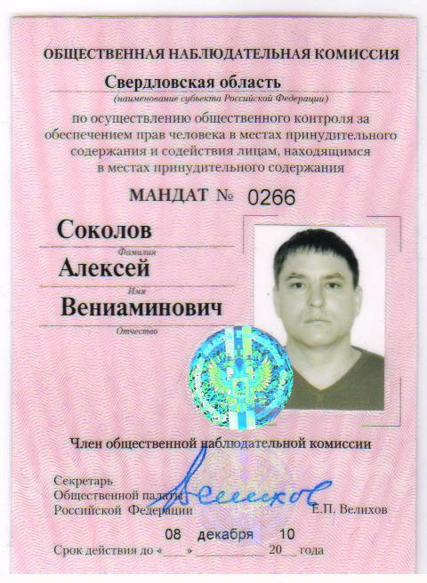 Напомним, что Алексей Соколов – руководитель общественной организации "Правовая основа", член свердловской областной "Общественной наблюдательной комиссии по осуществлению общественного контроля за обеспечением прав человека в местах принудительного содержания". Такие комиссии созданы в российских регионах в соответствии с принятым год назад федеральным законом "Об общественном контроле за обеспечением прав человека в местах принудительного содержания и о содействии лицам, находящимся в местах принудительного содержания". Кандидатуры в эти комиссии предлагают общественные объединения, но персональный состав каждой утверждает Общественная палата РФ.