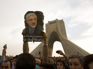 В самом центре Тегерана на проспекте Азади вопреки запрету властей в понедельник собрались сотни тысяч сторонников Мусави. Демонстранты требовали повторного проведения президентских выборов в Иране. К вечеру их число не только не уменьшилось, но продолжало расти с каждым часом. Согласно данным французских журналистов из Тегерана, ссылавшихся на иранских полицейских, оно достигло полутора-двух миллионов человек.