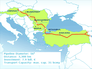 Участниками проекта Nabucco стоимостью 7,9 млрд евро (12,3 млрд долларов) являются австрийская компания OMV, венгерская MOL, болгарская Bulgargaz, румынская Transgaz, турецкая Botash и немецкая RWE. Каждый из участников консорциума "Международная компания Набукко" обладает равными долями по 16,67%. Начало строительства газопровода длиной 3300 км и мощностью 31 млрд кубометров газа в год намечено на 2011 год. Первые поставки сырья должны начаться в 2014 году.