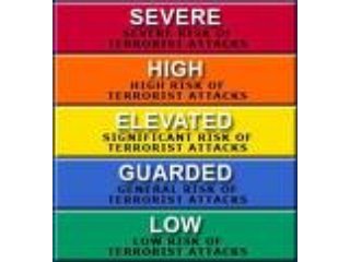 Введена же она была в марте 2002 года, вскоре после терактов 11 сентября 2001 года. В ней насчитывается пять уровней, каждому из которых присвоен свой цвет. Самый низкий уровень опасности - зеленый, далее по возрастающей следуют голубой, желтый, оранжевый цвета. Наконец, красный означает наиболее высокую степень опасности.