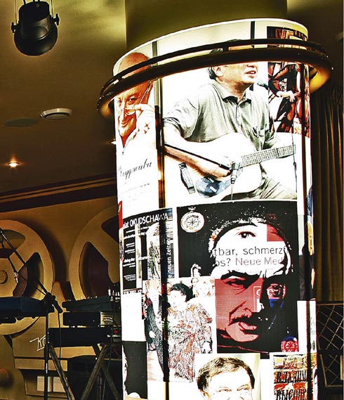 На заднике сцены — вращающиеся бобины старой «Кометы». На афишных тумбах анонсы Высоцкого, Окуджавы, Ростроповича… Фотографии Бродского, Галича искусно подсвечены, как дорогие экспонаты лучшего музея. В фотографиях без сомнения узнается рука Валерия Плотникова. Один из хитов — советские газеты с кричащими заголовками, которыми оформлен бар. Даже в туалетах порезвились: рядом с мягчайшей двойной туалетной бумагой — нарезанная современная газетка. Это все изыски художника Игоря Макарова.
