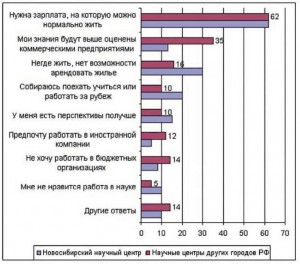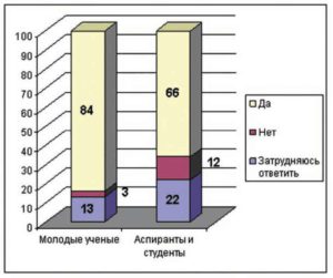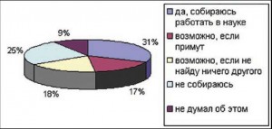 — Отвечая на вопрос «Собираетесь ли Вы после окончания учебы остаться работать в научном институте/университете?», лишь треть аспирантов и студентов РФ проявили однозначную ориентацию на науку, еще 35% из них рассматривают ее как возможную сферу приложения труда в зависимости от обстоятельств (рис.1). По данным Министерства образования и науки РФ и опроса, проведенного И.Г.Дежиной [2], не более 10% выпускников аспирантуры остаются в дальнейшем в науке.